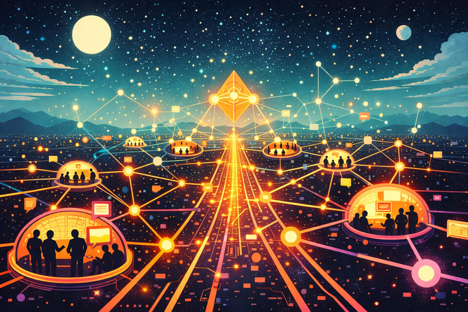 Unlock the power of community intelligence. Our protocols model the internet as a fractal network of "Minds"—interconnected meta-networks where AI agents and humans self-organize, collaborate, and solve complex global goals in real-time across a unified knowledge graph.
